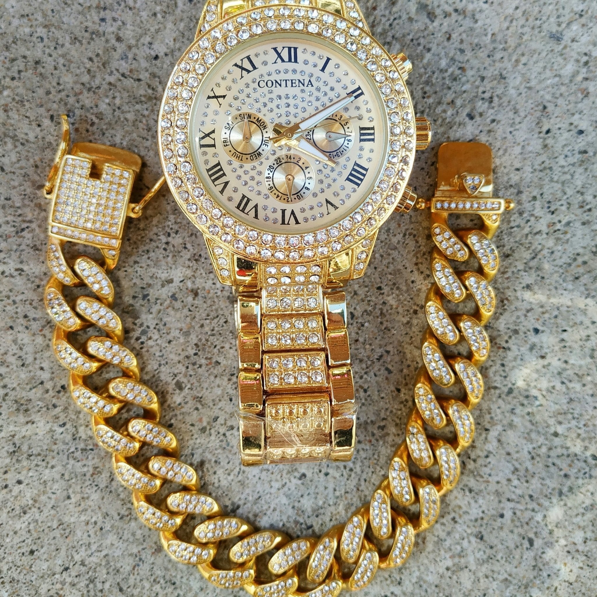 The Miami Double Bezel Watch and Bracelet Set is the perfect set to show off your style and fashion sense.The stylish Diamond Double Bezel Watch teamed up with the Diamond Miami Cuban Link Bracelet for an unforgettable duo.